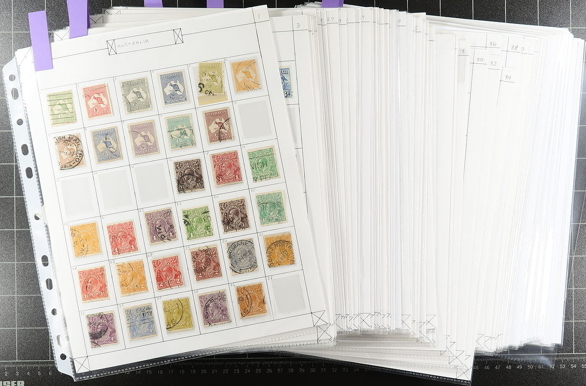 Australia - Nice collection of primarily used Australia, 1913-2001, containing a few thousand stamps on roughly 75 homemade and Minkus album pages. The collection generally ranges from Scott #1/1932, and includes a small selection of Kangaroos and KGV Heads, back of the book issues, including officials and postage dues, and much more. A cursory check indicated singles, sets, and partial sets cataloguing $10 and including J86-J95 (mh, c.v. $179 total), leaving other finds to collectors. A nice lot for the Australia collector, and should be continued until completion, overall fine to very fine. Owner's older 2013 Scott US$1,634.00 =