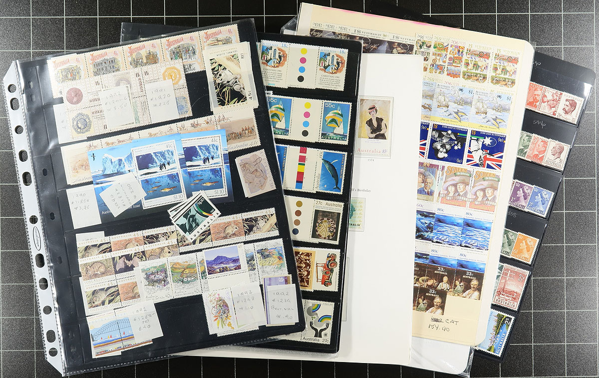 Australia - Lovely grouping of never hinged Australia, 1920's-2007, containing many hundreds of stamps in a variety of formats. The lot begins with "The Australian Territories Collection", from Australian Post which includes many sets, souvenir sheets, and sheetlets, from 1995 to 2007, noting representation from Australia, Cocos (Keeling) Islands, Christmas Island, and Australian Antarctic Territory. The lot continues with a stockbook containing mostly gutter blocks, strips, mini panes etc from the 1970's to 2003, along with singles, sets, blocks, and more from the 1920s onwards. A lovely lot for all collectors with good catalogue values and face value potential. Estimate =
