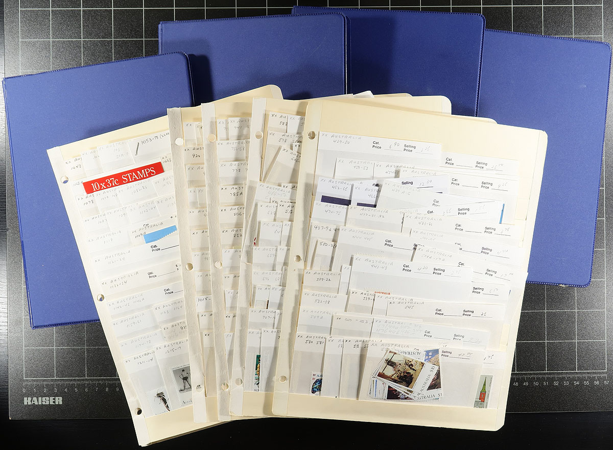 Australia - Dealer stock of mint Australia, 1967-1994, containing many hundreds of stamps in several hundred 102 cards in 4 counter books, and neatly arranged in a handful of stock pages. The lot ranges from Scott #429/1380, with each card containing a single or set, with each card identified by Scott number along with retail or catalogue pricing. Owner's Scott or catalogue pricing for the lot totals US$1,307.00. A bit of duplication noted for some issues, with a mix of mint hinged and never hinged throughout. A nice lot for dealers or collectors alike. Estimate =