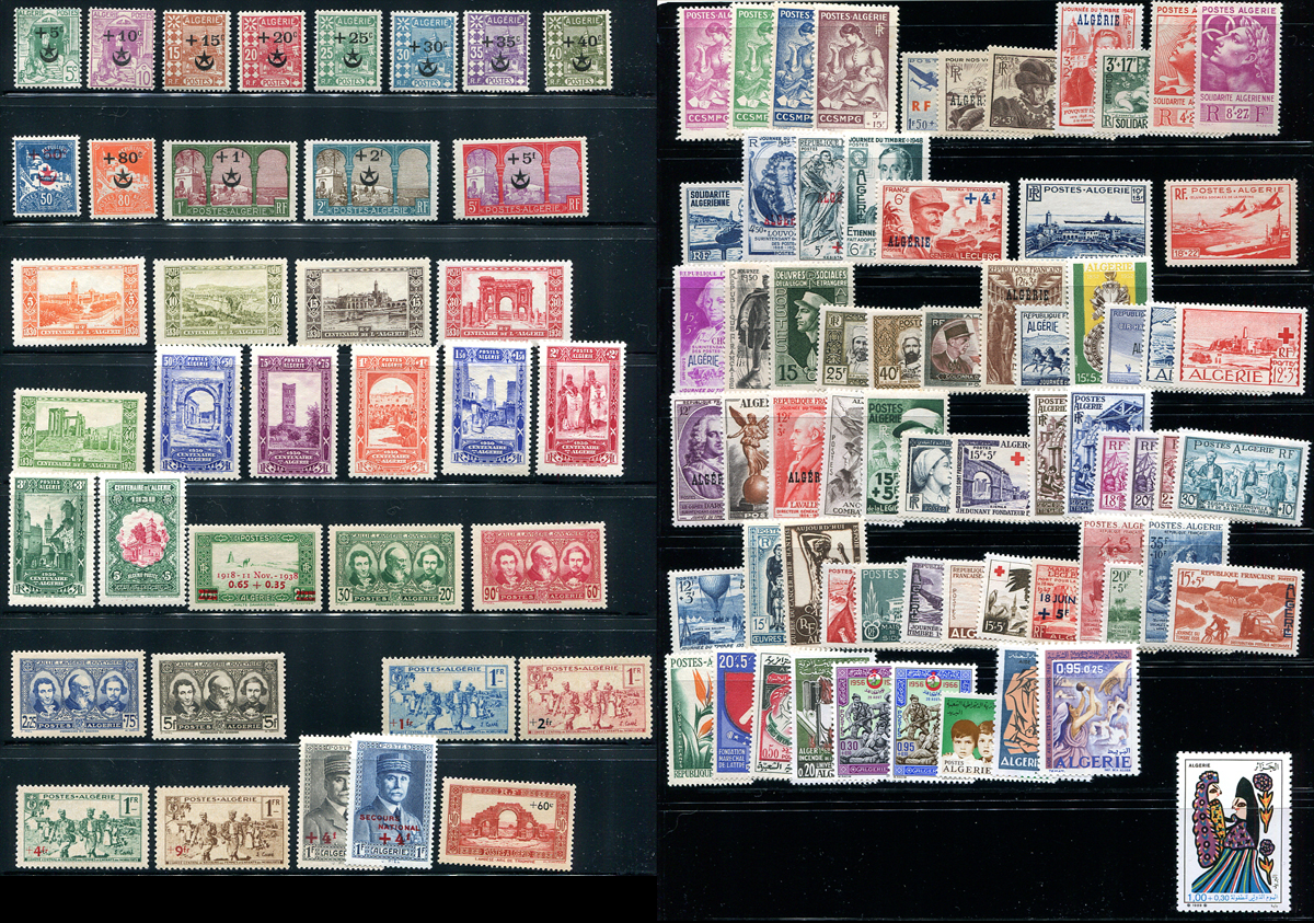 Algeria #B1-B105. Complete mint run of semi-postals up to 1989 (and missing only 8 later, and quite inexpensive items to complete the series). Most are lightly hinged or never hinged. Lots of typical French colonial issues, including overprints and revaluations of French stamps and topicals for Red Cross or North African themes. 2024 Scott US$553.45 =