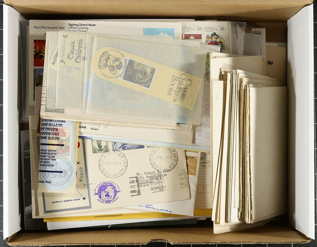 Australia - Group of roughly 200 Australia first day covers, 1940-2000's, noting singles, sets, souvenir sheets, and high denomination frankings. Also encountered were a few numismatic covers, and a few interesting bookmarks with first day cover cancellations. A nice lot for cover, topical, and thematic collectors, noting several suitable subjects with colourful cachets. A few corner bends on a few covers, overall fine to very fine. Estimate =