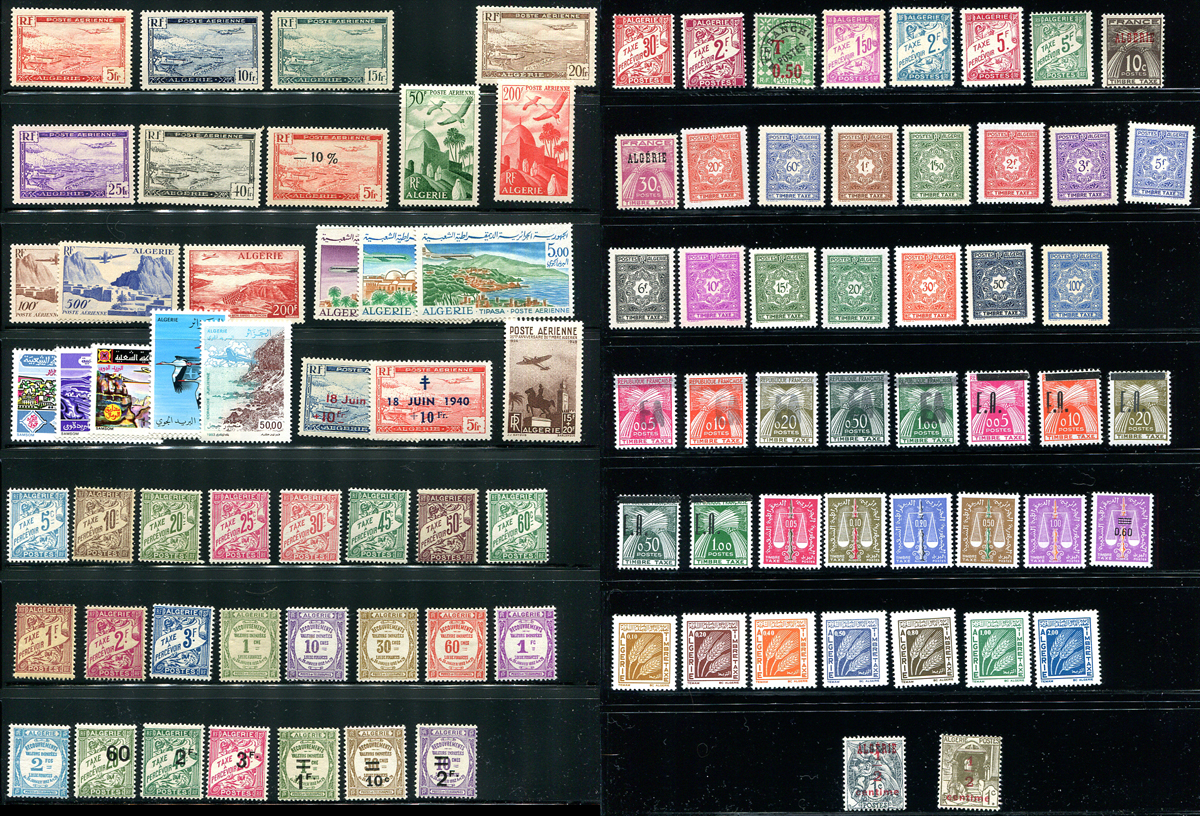 Algeria #C1/C22, CB1-CB3, J1/J66, P1-P2. Two pages of mint "back of the book" with a near complete selection of airmail (missing only three), and complete groups of the semi-postal airmails and newspaper stamps. The postage due selection is quite thorough (missing only a half dozen examples) including the 1962 Independence overprints with both handstamp and typographed overprints. Fresh, fault free and most are lightly hinged or never hinged. 2024 Scott US$494.00 =