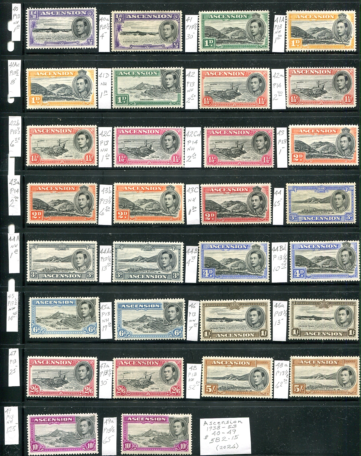 Ascension #40-49. Wonderful assembly of 1938-1953 George VI issues, included sub-listed perforation types, all neatly arranged and identified on a single stockpage. All mint, mostly Lightly Hinged but with some Never Hinged noted. We don't in-depth of these groups often. 2026 Scott US$582.15 =