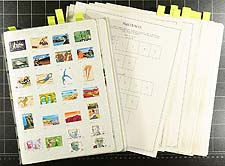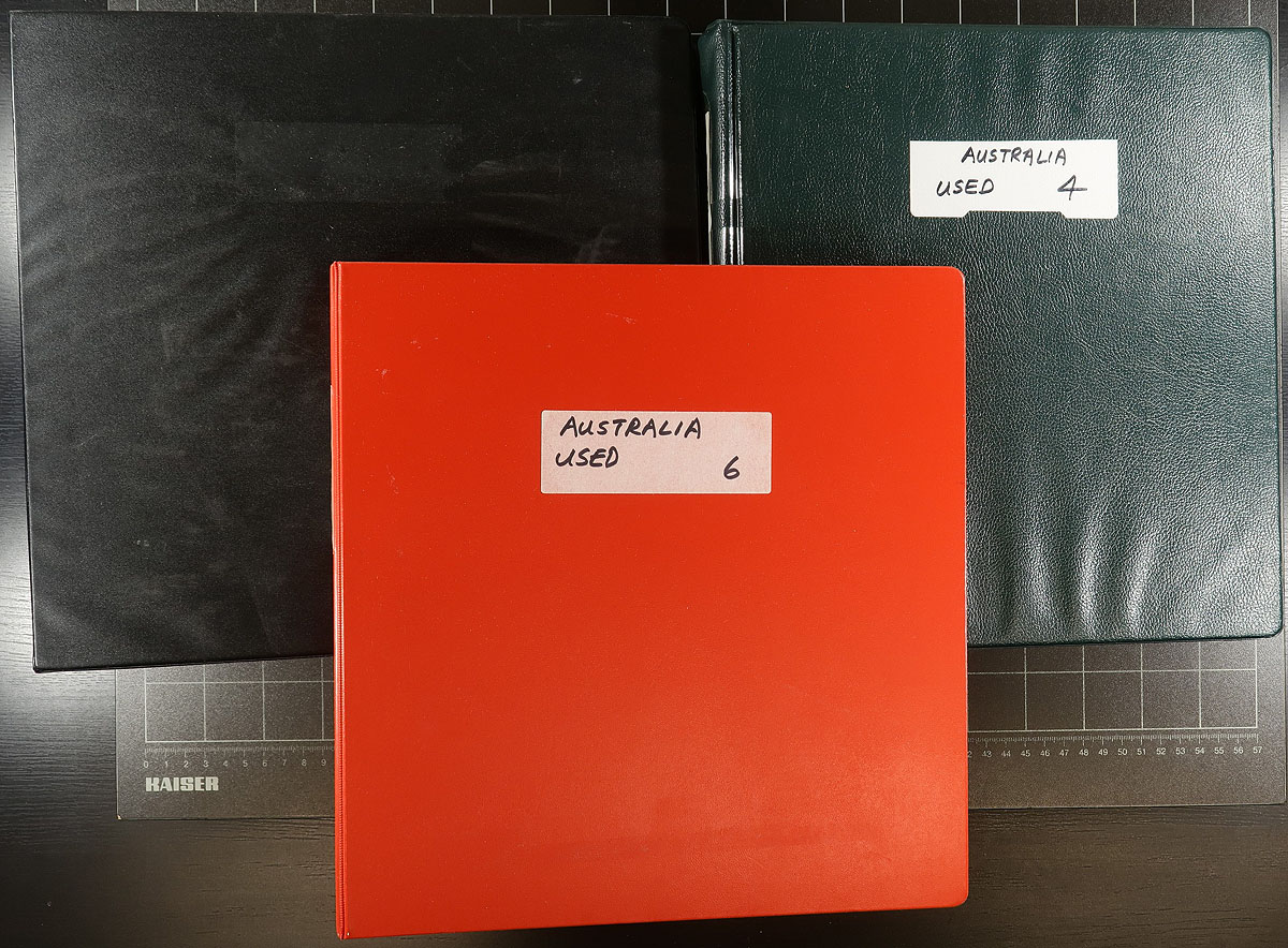 Australia #439A/1522. Extensive used accumulation of regular issues circa 1970-1996 on over 110 manila stockpages and packed into three large binders. Extensive coverage with up to a dozen of a type, including lots of sets (with many of the higher values paying overseas rates). Better singles include a block of seven from the Christmas ’71 issue (#508), and several complete "Famous Australian" booklet panes (#454a-457a (First day cancels) and #514a-517a (2 sets). Also noted the paintings to $10.00 (#579) and 8 copies of the $20 Uluru (#1135). About 10,000 stamps here, neatly organized and identified, and unknown (but massive) catalogue value. No souvenir sheets. Estimate =