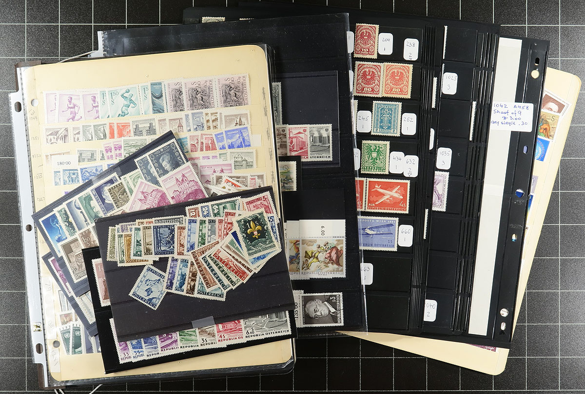 Austria - Accumulation of primarily never hinged Austria, 1908-1993, containing about 1,600 stamps in roughly 15 stock or album pages. The lot generally ranges from Scott #119a/1417, containing sets, partial sets, souvenir sheets and back of the book issues. Owner's 2019 Scott catalogue value for the lot totals US$765.00, with duplication between 5 to 10 for some issues. A clean lot for all collectors. Estimate =