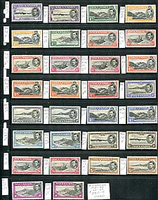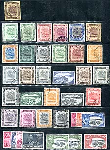 Bermuda #123/128b. Calling all King George VI "Keyplate" specialists. This mint accumulation has been catalogued as the lowest price by perforation (either p.13 or p.14). However, a quick glance indicates that there are shade variants here that could benefit some work through Stanley Gibbons. A number are never hinged, most of the rest are lightly hinged and only a couple have minor remnants. Some come from wartime printings which have resulted in acidification of the gum (not "tropical staining"). Well centered and lovely. 2024 Scott US$1001.00 =