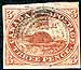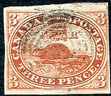 Canada #4. VF used example of the 1852 issue 3p red beaver imperforate on soft ribbed paper, with four margins (tight but still clear on right). Attractive concentric ring postmark. 2025 Scott US$200.00 =