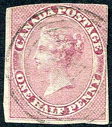 Canada #8. VG appearing used example of the 1857 issue QV half-penny rose imperforate on wove paper. Cut in at top / left and a small thin, visible from the back. That being said, this could be a very reasonably priced way to fill this spot in your album and then upgrade later if so inclined. Postmarked with light, but readable "37" Quebec 4-ring postmark. 2025 Scott US$700.00 =
