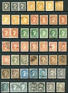 Canada #21/30. A seldom offered extensive collector's assembly of Large Queens, mostly used (with the exception of one 1/2c black, mint hinged). A total of 49 stamps, with noted shade / paper varieties and better postmarks. A couple small faults to be expected, but overall a very clean group. An excellent opportunity for the Large Queen specialist, or someone looking for a seldom seen large offering to help sort out this often confusing issue. All valued as basic stamps, so plenty of upside when searching through for shades / papers. 2025 Scott US$5,595.00 =