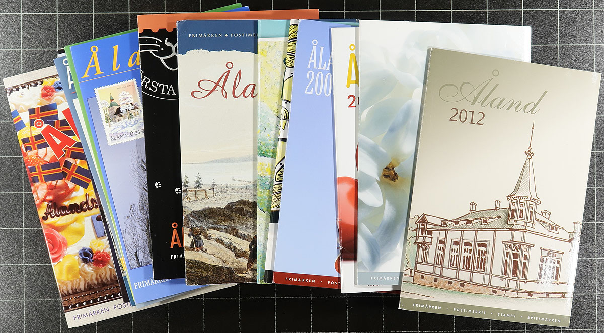 Aland - Pristine Post Office Year Set Folders, complete 1997-2012 with the complete run of mint stamps, souvenir sheets and booklets issued for the year. This period saw the transition from Finnish Markka to Euro in the year 2000. The owner estimates the face value alone to be near €200.00 ($325.00 CDN) and catalogue value $700.00. Estimate =