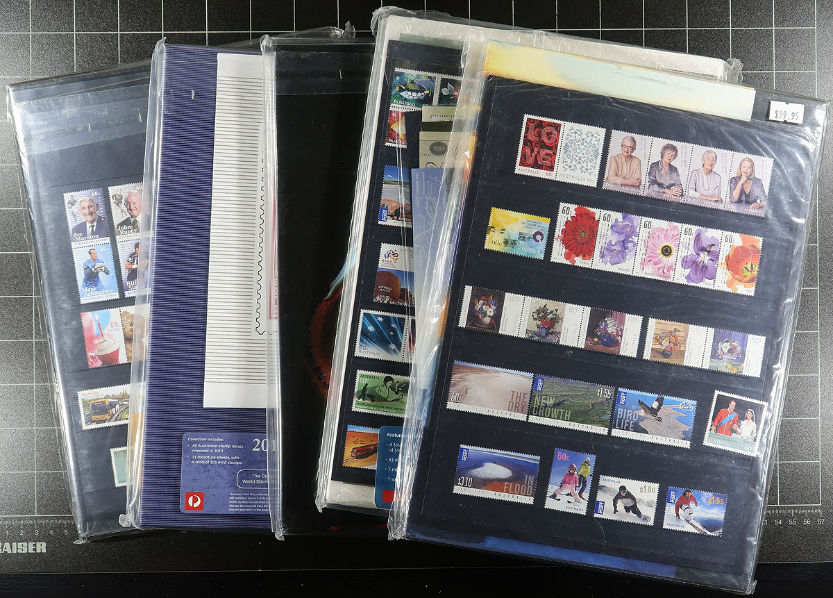 Australia - Consecutive quintet of hardcover annual year sets covering 2010 to 2014, in their original sleeves (most have been opened, but the stamps are untouched in their separate packs). Each contain about 100 stamps per year, including 7-10 souvenir sheets. Individual stamps have face values up to A$10.00. Includes lots of topical appeal (e.g. animals, sports, flora, stamp on stamp), etc. Each book is about 48-pages to enhance your knowledge of the stamps and what they commemorate. We don’t often see down-under sets that are this recent. With no premium for the albums, the total face value of the stamps is AUD$486.35 in Canadian Dollars =