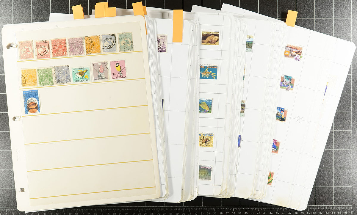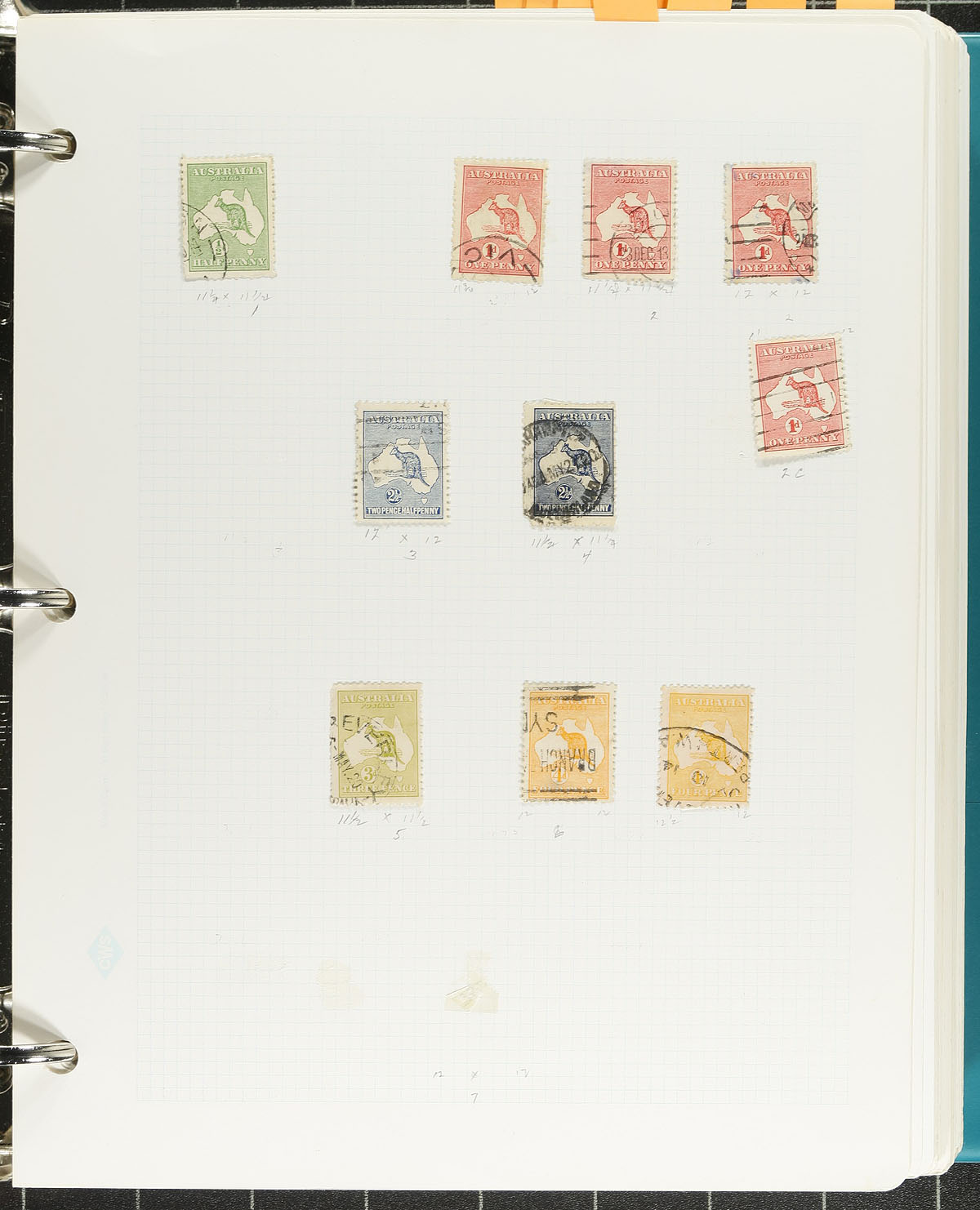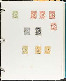 Australia - Nice collection of primarily used Australia. 1913-1999, containing roughly 1,500 stamps on over 85 homemade pages housed in a thick binder. This well organized collection generally ranges from Scott #1/1746. including a good selection of used Kangaroos with #s 5, 6 (x2), 8-10. 38-39, 42, 45-52, along with KGV Heads, several sets and partial sets, and a small selection of back of the book material. The collection also includes a few perforation varieties, shades, and a few mint stamps (mostly gutter pairs from the 1980's onwards). A spot check indicated some material cataloguing $15 and up, with the owner's 2001 Sedona retail catalogue value for the collection totaling $1,492.00 (US$). A nice lot for Australia or British Commonwealth collectors, overall fine to very fine. Estimate =