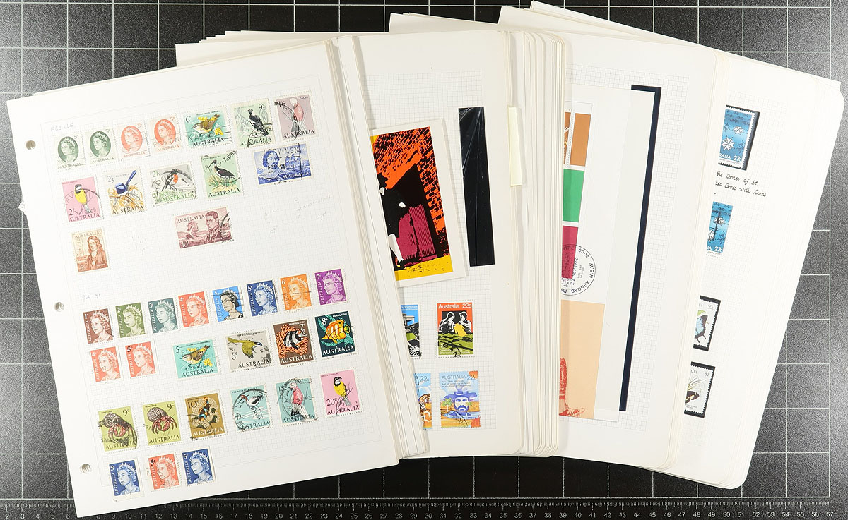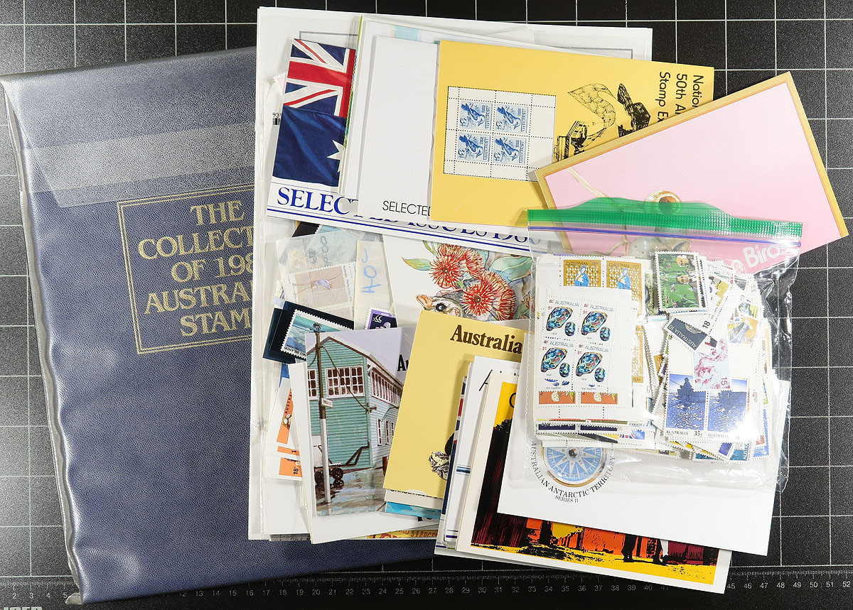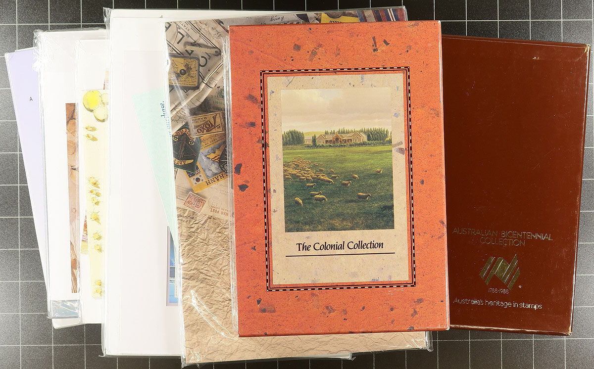 Australia and New Zealand - Mint and Used Group. Combination of two final consignment lots consisting of Australian Post Office mint products, covers and cards plus a quantity of used New Zealand on paper (mostly late 20th century period). The bulk of the lot value is in the Australia which includes the "Links" set of booklets, the "Colonial Collection" book, the "Living Together" folder, the "Australian Impressionists" book, the "ANZAC Tradition" book, the "Antarctica" book, the"1788-1988 Australian Bicentennial Collection" plus six additional smaller collections. Pretty hefty total price tag if valued by Seven Seas or another specialized Australian catalogue. Estimate =