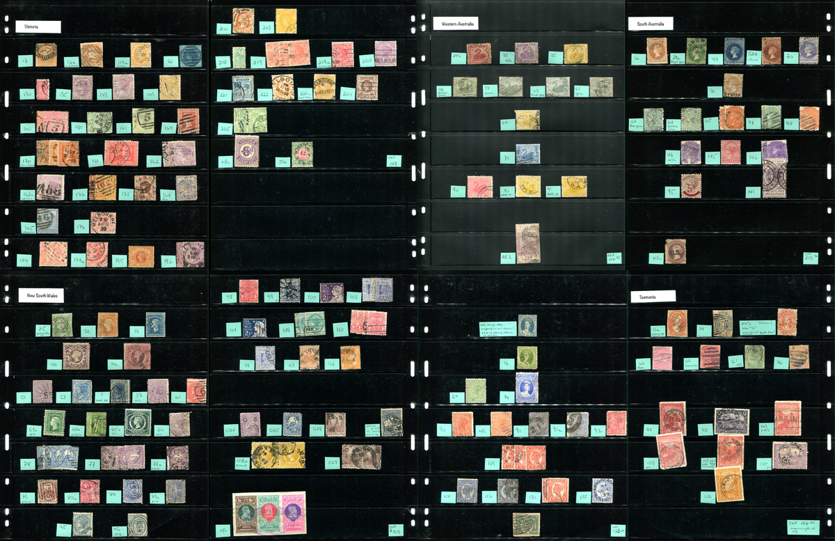 Australian States - A quality used selection from all six Australian States, being an excellent "foot in the door" starter group, or study assembly for someone looking to search for varieties. A total of 172 stamps, neatly arranged and identified on Vario stockpages. While the owner has not cataloged the stamps clearly faulty, expect the of small fault (short perfs, etc). Owner's 2021 Scott US$1,070.00 =
