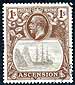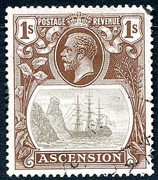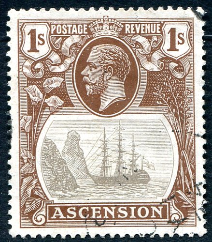 Ascension #18 Variety. VF used example of the "Torn Flag" variety of the 1924-1933 issued 1sh brown and gray George V "Seal of the Colony" issue. There is a small 2mm tear at UL margin, otherwise VF! Noted listed in Scott catalogue, but listed in Gibbons as #18b. A great example of this error. 2024 Gibbons £650.00 in CDN Dollars =