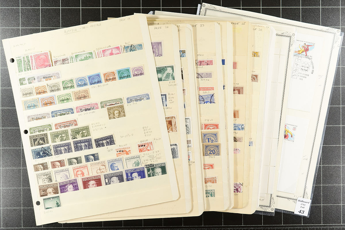 Austria - Accumulation of primarily never hinged Austria, 1900's-1990's, containing several hundreds of stamps in a variety of formats including a couple of stockbooks, album and stock pages, glassines, etc. A spot check indicated material primarily ranging from Scott #91/1608, including a few airmails, souvenir sheets, and more, with a few items cataloguing $10 and up. Owner's 2018 Scott value for the lot totals US$937.00. A nice lot for all collectors. Estimate =