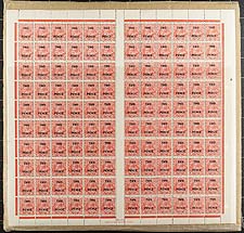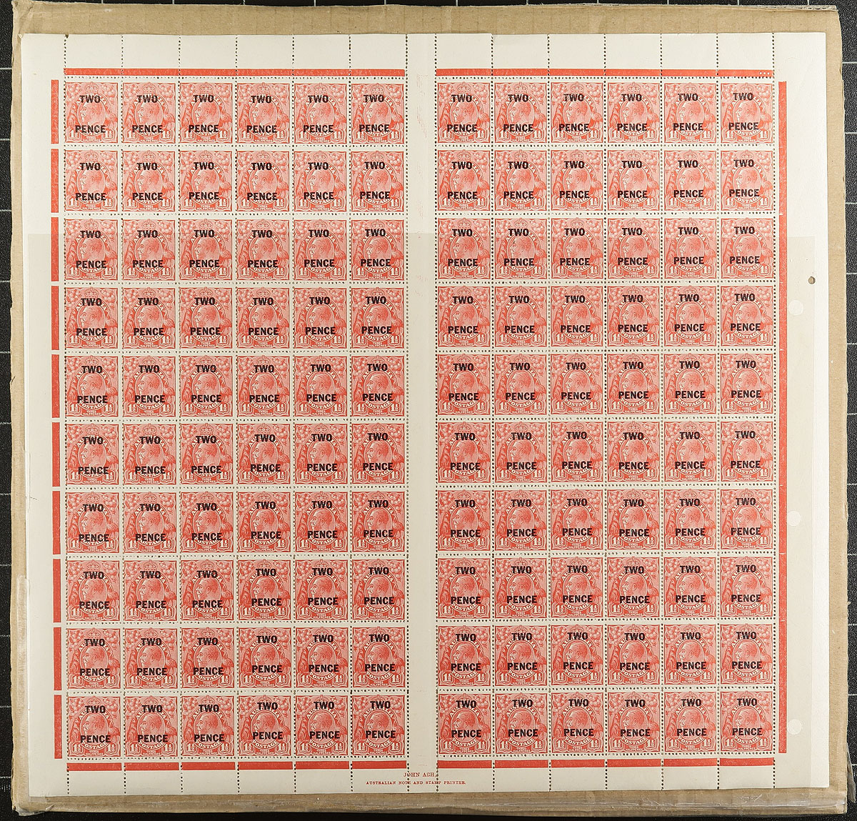 Australia #106. A striking complete sheet of 120 George V "Head" 1930 issue "TWO PENCE" surcharge. From Plate #3, with constant plate variety "sliced O in surcharge" (left pane, position 60). Mint Never Hinged, folded down the centre of the gutter with a few spots of separation. Would look great framed! 2025 Scott US$480.00 =