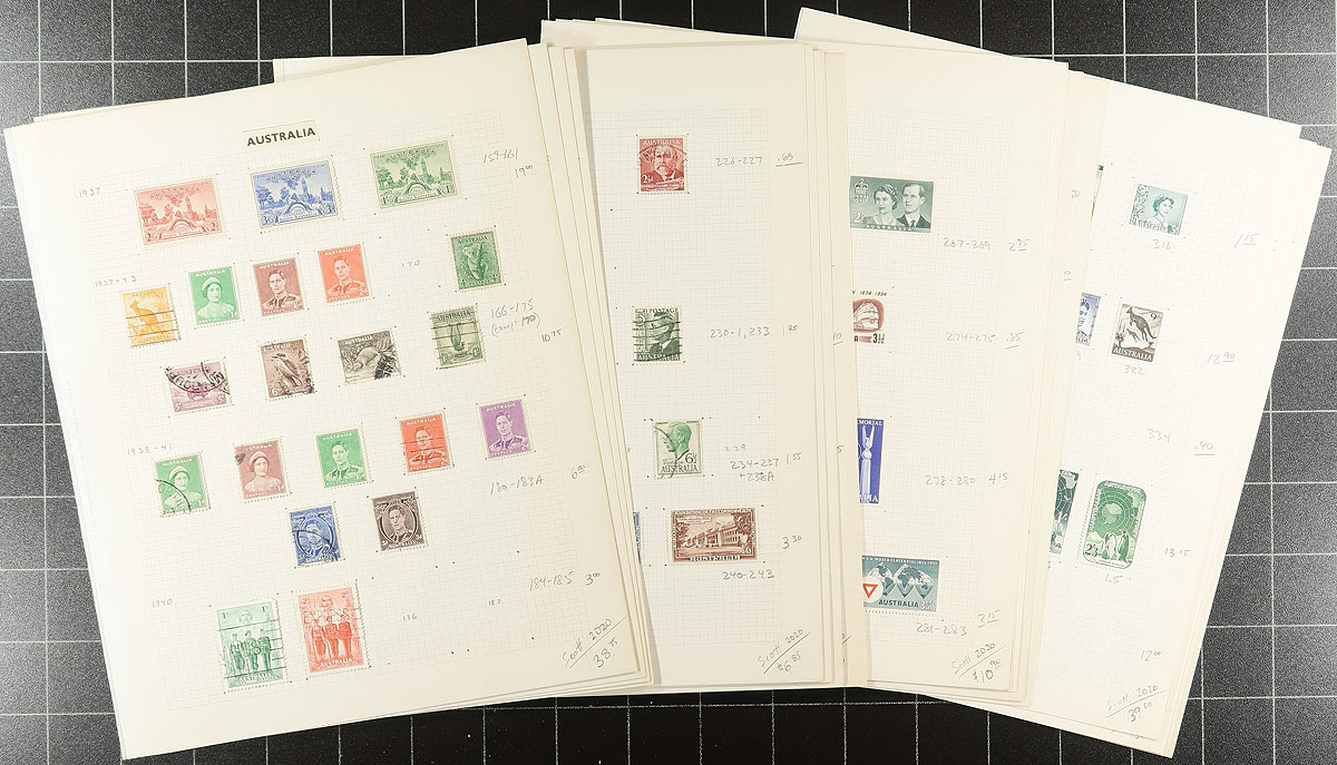 Australia - Well organized collection of used Australia, 1913-1998, containing roughly 1,400 stamps on about 100 homemade pages housed in a binder. This well organized collection generally ranges from Scott #1/1705, including a good selection of Kangaroos and KGV Heads, along with singles, sets, and partial sets, with a few cataloguing $10 and up. We estimate roughly 75% completeness in period, and should be continued until complete. Online photos show a sampling, overall fine to very fine. Estimate =