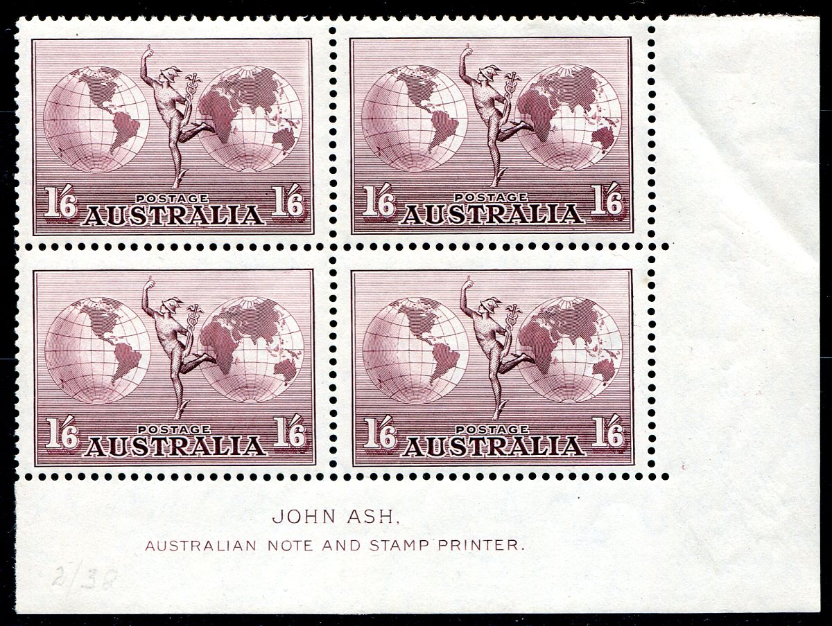 Australia #C5. F/VF mint lower-right inscription block of the 1934 issued 1sh6p "Mercury and Hemispheres" airmail issue. Full "John Ash, Australian Note and Stamp Printer" inscription. One stamp is Lightly Hinged, with three stamps being Never Hinged. Light bend in selvedge UR, not affecting stamps. Catalogued as 3 NH and 1 Hinged singles (but should be worth more as an inscription piece). 2025 Scott Classic US$332.50 =
