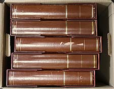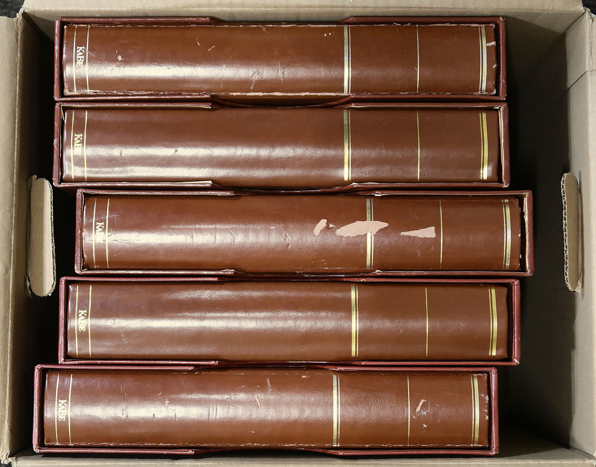 Australia - Collection in 5 hingeless KA-BE albums with slipcase. The star attraction are the albums, with hingeless pages ranging from 1913-1999, including spots for souvenir sheets and panes, and includes pages for Antarctica ranging from 1957 to 1999. The lot includes many hundreds of stamps, including a few used Kangaroos, and partially used sets up to the 1970's, along with scattered never hinged sets up to the early 1990's. We estimate face value material to be in the $80 to $100 range. A good starter collection in worthy albums that would have originally cost $1,000 in a retail environment. Estimate =