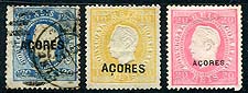 Azores #14, 26f, 49b. A trio of early issues 1868-1885 from Azores including #14 (used), #27f (type C, perf 13.5, unused no gum) and #49b (overprint D, perf 13.5, enameled paper, unused no gum). 2025 Scott US$317.50 =