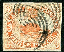 Canada #4. Fine+ used example of the 1852 issue 3p red beaver imperforate, with three margins and just-in on bottom. Attractive concentric ring postmark. 2025 Scott US$200.00 =