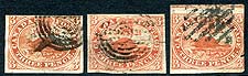 Canada #4 Study Group. VF/Fine appearing, but all with faults (cut in margin, crease, "nick") group of three examples of the 1852 issue 3p red beaver imperforate. From an old-time collection, unchecked for plating / varieties. Estimate =