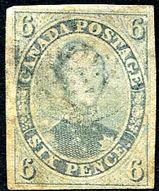 Canada #5b. Fine used appearing example of the 1855 issue 6p greenish gray Prince Albert imperforate on wove paper. Four margins (just close at bottom) but a bit "washed" in appearance. Still a good example to add to a collection, and upgrade later if so desired. 2025 Scott US$1,150.00 =