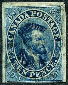 Canada #7. Fine+ used example of the 1855 issue 10p blue imperforate Cartier on thin pelure paper. Margins full to large on three sides, but just into design on bottom. A pretty example of this elusive stamp. 2025 Scott US$1,500.00 =