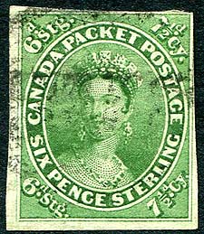 Canada #9. Attractive appearing used example of the 7½p green Queen Victoria 1857 imperf pence issue, with two clear margins on bottom/left, and in at top/right and hinge thin on top visible from the reverse. Even with cut-in margins / thin, this is still a very presentable stamp to fill a spot in an album that we see more empty than not. 2025 Scott US$3,000.00 =