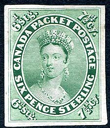 Canada #9p. VF proof in green (lighter than the colour of issue) on India paper of the green 7½p Queen Victoria (no SPECIMEN overprint) 1857 imperf pence issue. Popular with collectors as a viable alternative to the actual mint stamp (which in Scott catalogues US$15,000.00 in mint condition!). Small thin from hinge, only visible from reverse. 2025-2026 Unitrade =