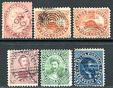 Canada #14, 15, 17, 18, 19. A used selection of six 1859 "Cents" issue (5 different), including a few better lightly cancelled examples. Unchecked for any re-entries / varieties. A few minor perf faults, as often seen on these issues, but overall fine. 2025 Scott US$715.00 =