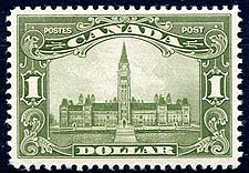 Canada #159. Fresh and VF centered mint Never Hinged example of the 1929 issue $1.00 olive green Parliament high value from the GeoV Scroll set. The $1.00 Parliament is considered by many to be the key GeoV era high value. 2025 Scott US$575.00 =