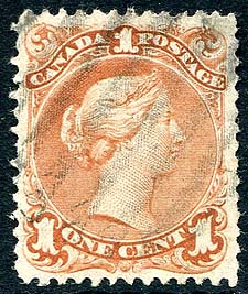 Canada #22a. Sound used example of the 1c brown red Large Queen on Bothwell watermarked paper. Shows the full "LS" of the watermark "E. & G. BOTHWELL CLUTHA MILLS". A very elusive Large Queen variety. 2025 Scott US$500.00 =