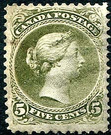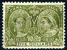 Canada #65. F/VF (close to VF) centered used example of the $5.00 olive green 1897 issue Queen Victoria Jubilee high value. Usual "smudgy" cancel, as seen on these high-values. A very minor hinge thin spot, mentioned "for the record". 2025 Scott US$1000.00 =