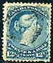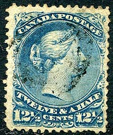Canada #28a. Fresh and F/VF appearing used example of the watermarked 12½c blue Large Queen, showing portion of the letter "& G" (inverted) of the "E. & G. BOTHWELL CLUTHA MILLS" watermark. Moderately cancelled and very decently centered. Pressed out crease and few short perfs. 2025 Scott US$450.00 =