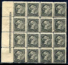 Canada #34. Mint sheet-margin inscription block of 16 of the 1/2c Small Queen. Full "British American Bank Note Co. Montreal" inscription in left selvedge. Several hinge reinforcements, but still an attractive positional inscription block. Conservatively catalogued as 16x single stamps. 2025 Scott US$360.00 =