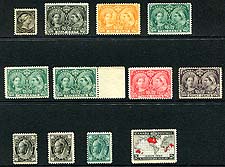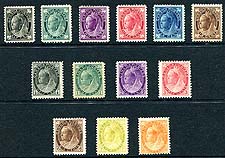 Canada #66-71, 74-76, 78, 80-82. F/VF mint Hinged group of 13 different issues from the 1897-1898 QV "Leaf" and 1898-1903 QV "Numeral" issues. Some very pretty individual stamps in the group here. 2025 Scott US$1,447.50 =