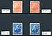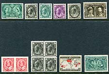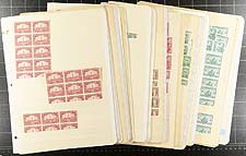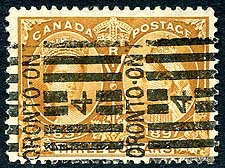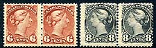 Canada #43, 44. FVG/Fine mint Never Hinged pairs of the 6c chestnut and 8c violet black QV Small Queens. Good colour on both, with interesting offset on the back of the 6c value. There is a drastic price difference between Unitrade and Scott on these, so we have opted to estimate the lot. Estimate =