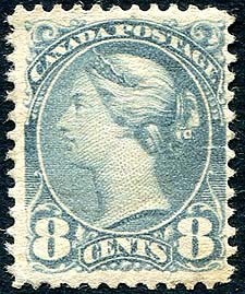Canada #44a. Fine mint OG Hinged example of the 8c blue gray QV Small Queen. An attractive example of this often elusive mint stamp. Small toning spot LR corner, mentioned for the record. 2025 Scott US$425.00 =