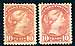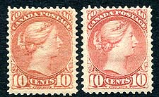 Canada #45, 45a. F/VF mint Hinged duo of 10c Small Queens, including the brown red (#45) and dull rose (#45a). The brown red (#45) has NH appearing gum, but it has been redistributed, while the dull rose (#45a) has original gum, hinged with some gum loss at top from hinging. That being said, both have great eye appeal, with well above average centering and freshness. 2025 Scott US$1275.00 =