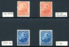 Canada #46, 47. Mint quartet of (two of each) of the 20c vermilion and 50c deep blue 1893 Widow's Weeds issues, with a range of hinging (as noted by the consignor). The LL example of the 50c value regummed, hinged and so conservatively catalogued as used. 2025 Scott US$1275.00 =