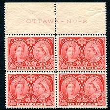 Canada #53 Imprint Block. F/VF mint Never Hinged upper sheet-margin block of four of the 1897 QV 3c bright rose, with full "OTTAWA - No. 2" plate inscription. Valued as 4x NH singles, but certainly worth more as an inscription block. 2025 Scott US$300.00 =