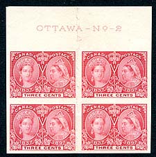 Canada #53 PROOF. VF example of the 1897 QV Jubilee 3c bright rose Plate Proof on india paper, mounted on card, in upper sheet-margin block of four, with full "OTTAWA - No. 2" inscription in selvedge. There is a vertical crease between the stamps, from when these sheets were stored before auctioned in the 1990 American Bank Note Company archive sale, this the only way to get this inscription block is with vertical crease. The basic catalogue value for 4x singles is $200.00, with Unitrade noting that inscription blocks (on regular stamps) are "scarce". Estimate =