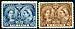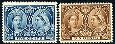 Canada #54, 55. F/VF mint Lightly Hinged duo of QV 1897 Jubilee issue, including the 5c deep blue and 6c yellow brown. Both nicely centered, and will likely be viewed as VF by many collectors. 2025 Scott US$270.00 =