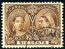Canada #55. Choice VF used example of the 6c yellow-brown 1897 QV Jubilee issue, with light unobtrusive "face free" postmark. A great used example of this tough stamp. 2025 Scott US$175.00 =