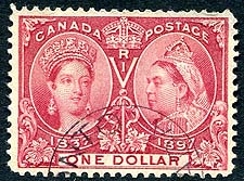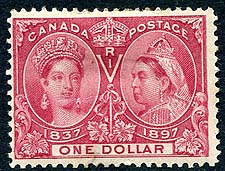Canada #61. VF appearing, used example of the 1897 issue $1.00 lake Queen Victoria Jubilee. Great colour and appearance with tidy CDS (very uncommon for $1.00 value), but with thin and short-perf at upper right. Still presents very well! 2025 Scott US$750.00 =