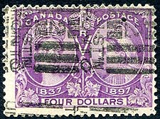 Canada #64. Fine used example of the 1897 issue $4.00 purple QV Jubilee, with clean "UNION ST'N TORONTO" roller cancel. A respectable example of this sought-after stamp. 2025 Scott US$1,000.00 =