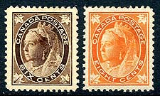 Canada #71, 72. VF mint Hinged examples of the 6c brown and 8c orange from the 1897-1898 QV Leaf series. Nice looking stamps, without having the pay the 200% NH premium! 2025 Scott US$465.00 =