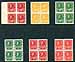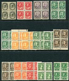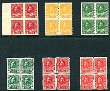 Canada #126a, 128a, 138, MR1-MR3. F/VF mint Hinged/Never Hinged group of 6 different "non-standard" George V Admiral blocks including the 1c yellow and 2c green part-perforate coils (2c with straight-edge left), 3c carmine imperforate and the first three "War Tax" issues. All hinged on top pair, never hinged bottom, valued as 2x Hinged and 2x Never Hinged per block (with the exception of the 3c imperforate, which has slightly disturbed gum, so wholly valued as hinged). 2025 Scott US$940.00 =